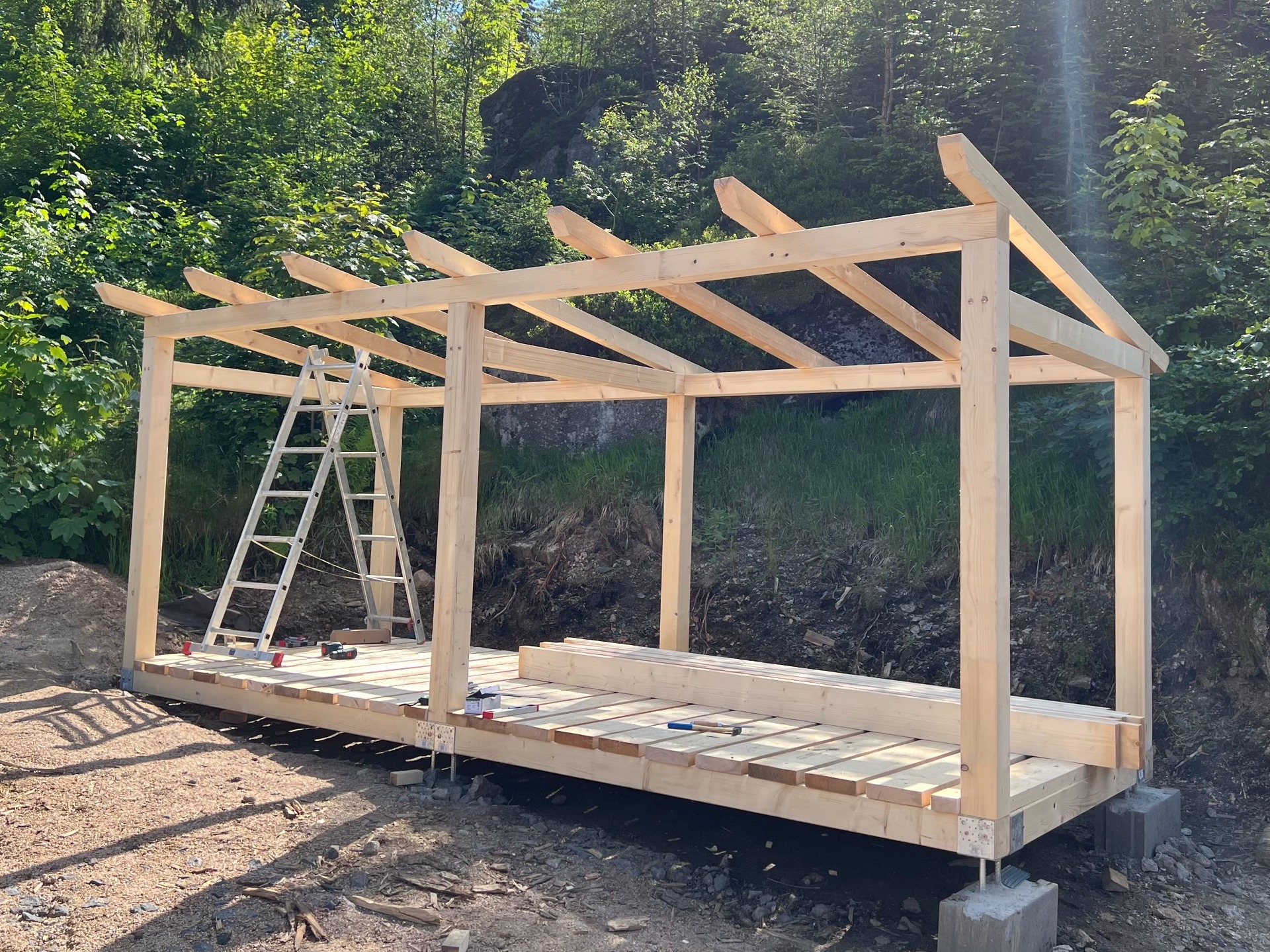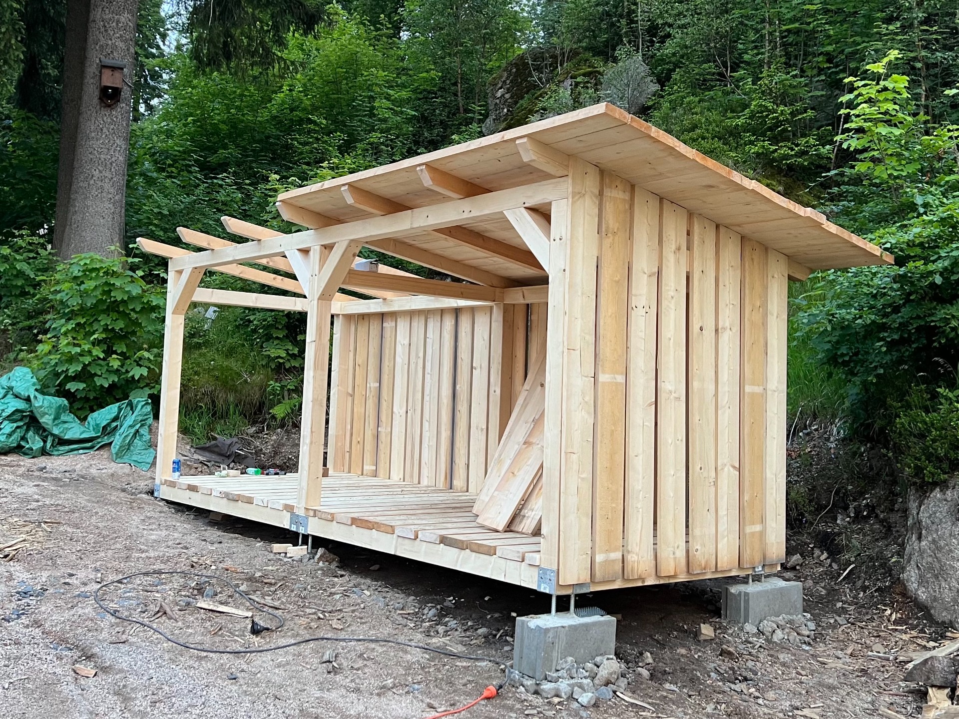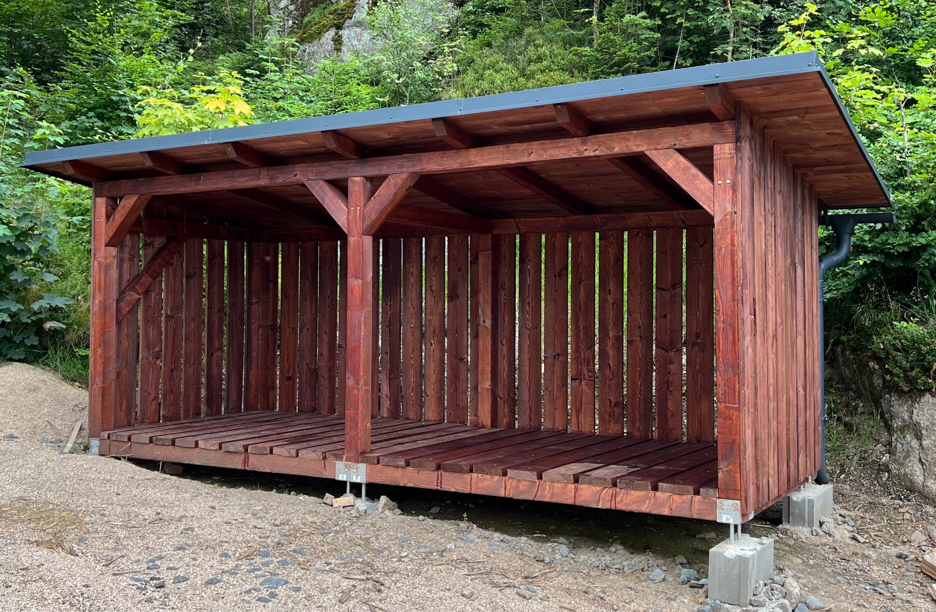 Masivní smrková konstrukce, pultová střecha s přesahem, pozinkovaný plech - stavěno na klíč včetně základových patek, kotvení a nátěru.
